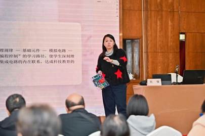 主题工作坊环节设置了5大特色专题,学员按需自主选择参与。清华大学附属小学李强老师的“让儿童站立科学教育正中央”、浙江省青少年科技教育协会理事刘俊的“分层筑基・融合创新:AI视野下的人工智能与集成电路教学实践”、中国教育装备行业协会教育信息化分会副秘书长赵博的“人工智能教育的实施策略与应用案例”等专题,从多元维度聚焦核心素养培育,引导教师设计创新性教学项目。杭州八一学校校长伍小斌分享的“把课堂变成引力场”实践策略,浙江省教育厅教研室沙琦波老师主讲的“凸显学科实践的科学教学”,为一线教师解决教学痛点提供可操作的实用方案,现场研讨氛围热烈,思想碰撞持续不断。